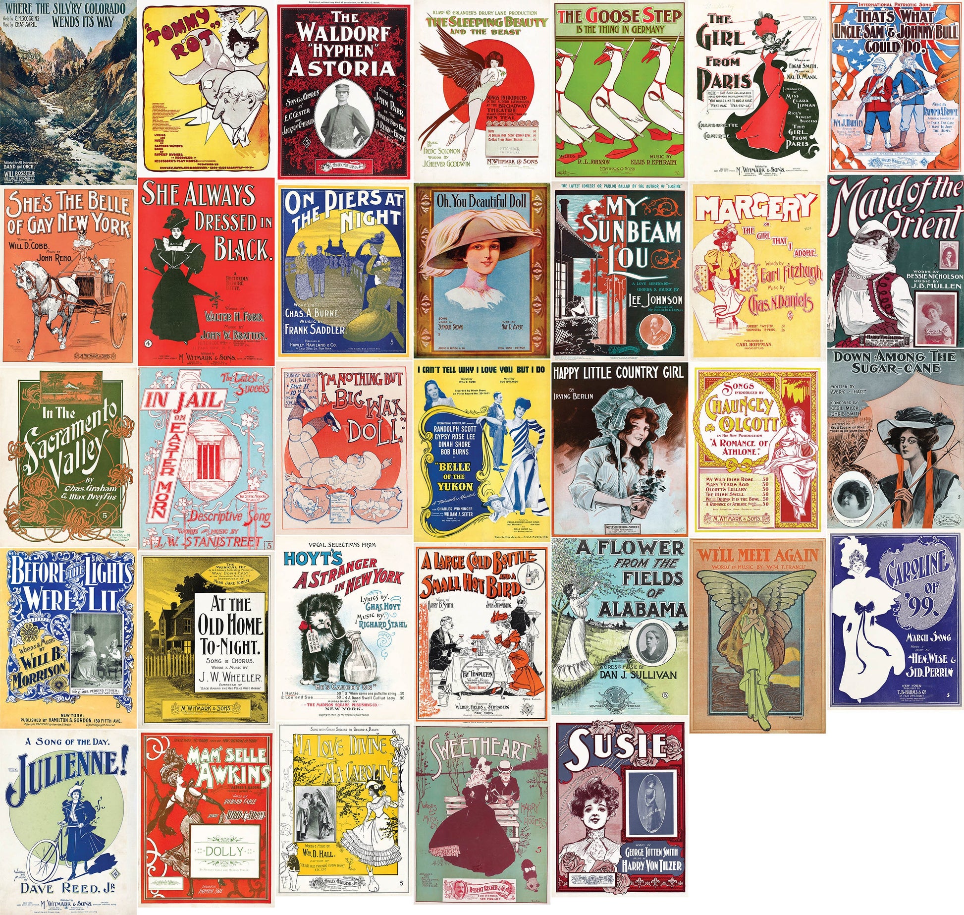 The late 1800s and early 1900s were a vibrant time for American music, with a wide range of popular songs and genres emerging during this period. This is a collection of posters from the period that draw inspiration from some of the most popular songs of the era, all done by various anonymous artists and printed by different print companies during the time.