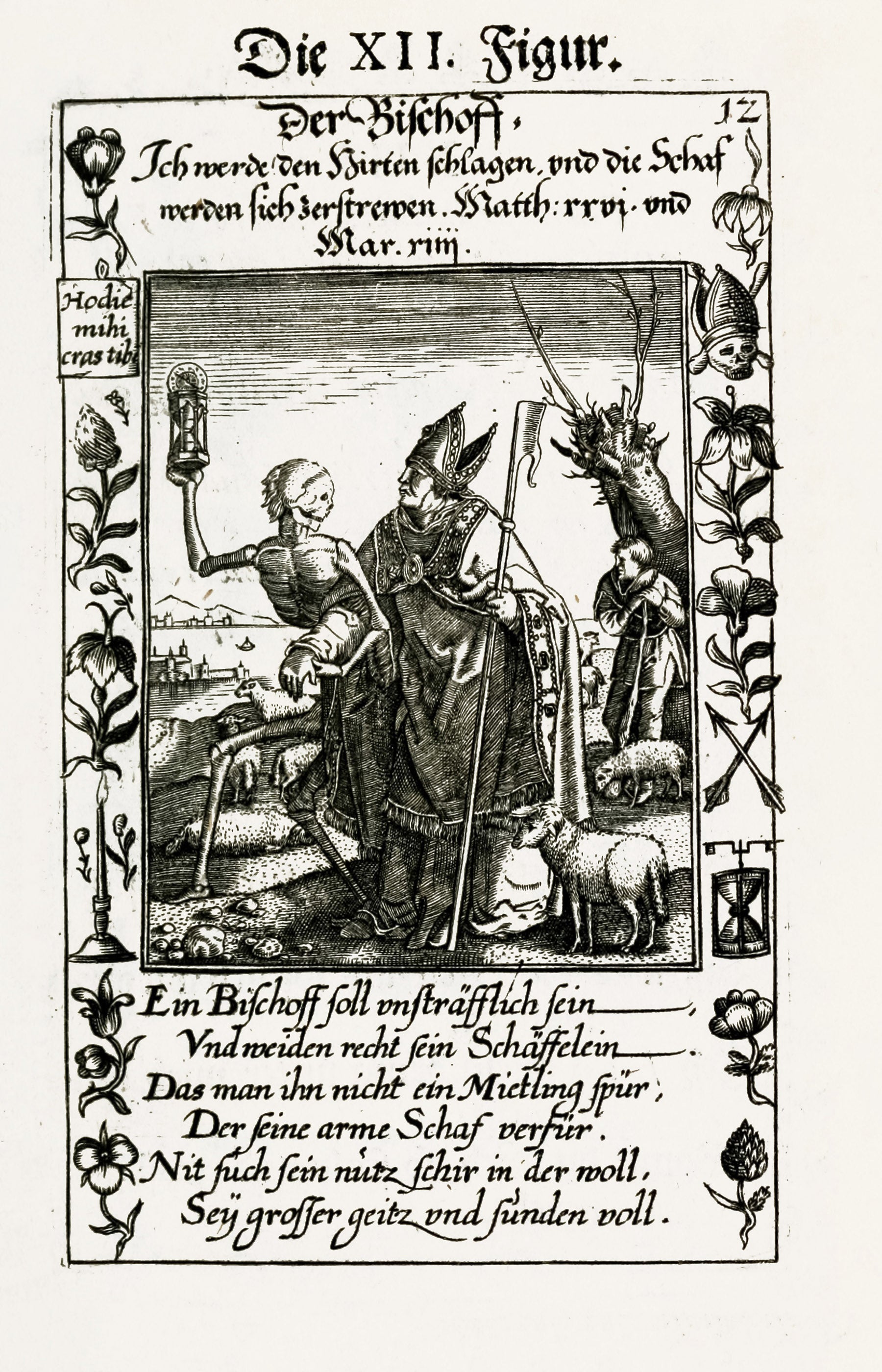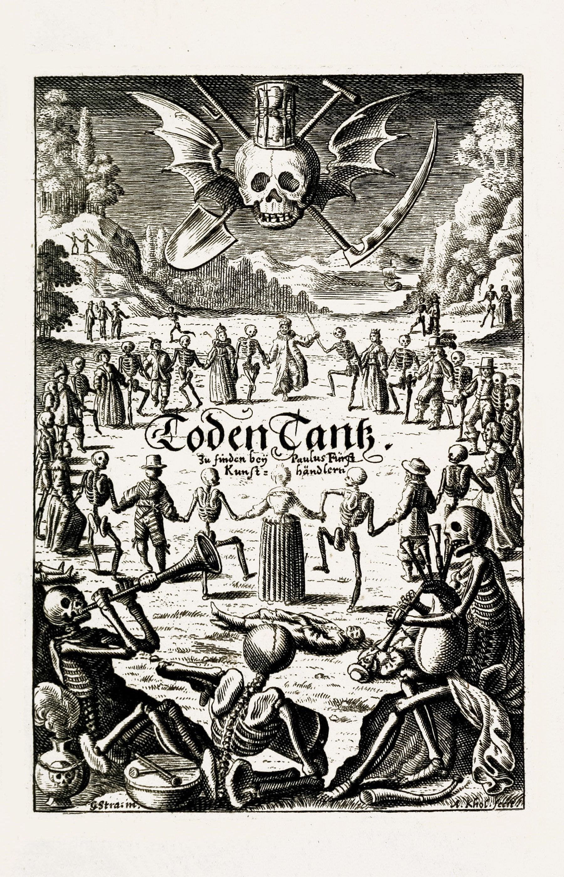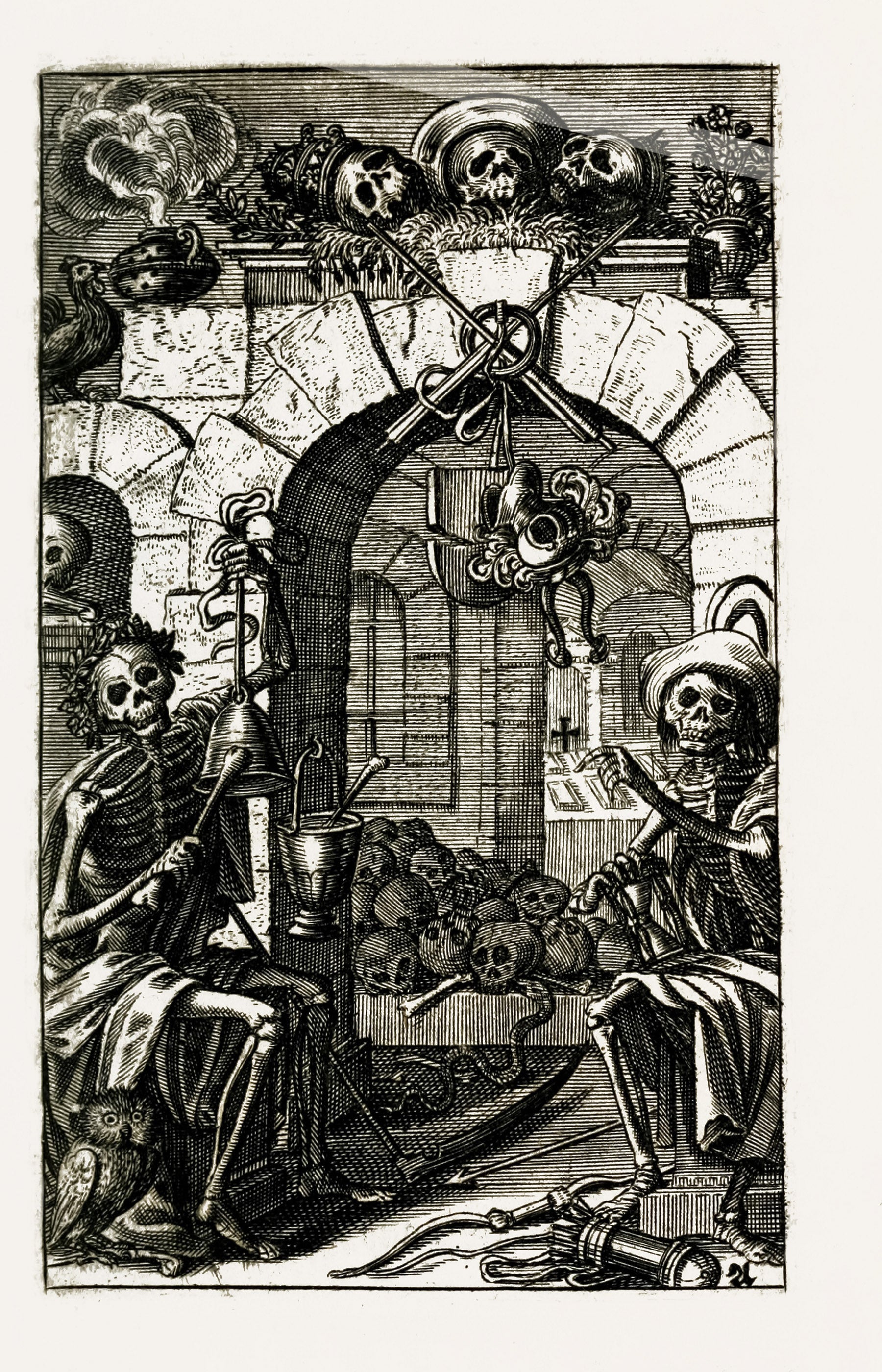 The book's illustrations are known for their detailed and often macabre depictions of death, including skeletons, graves, and scenes related to mortality. The accompanying text provides further context and reflections on the themes of mortality and the transitory nature of life.